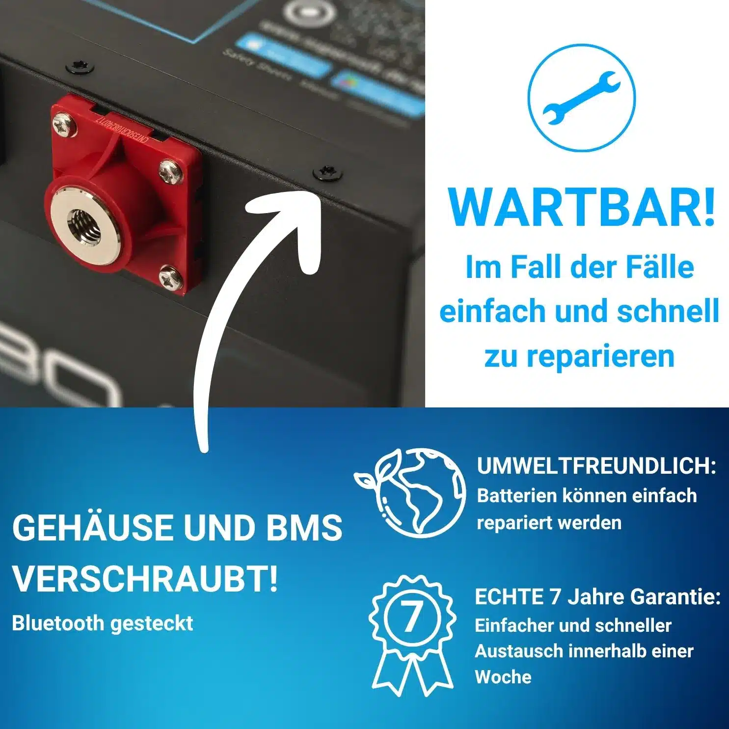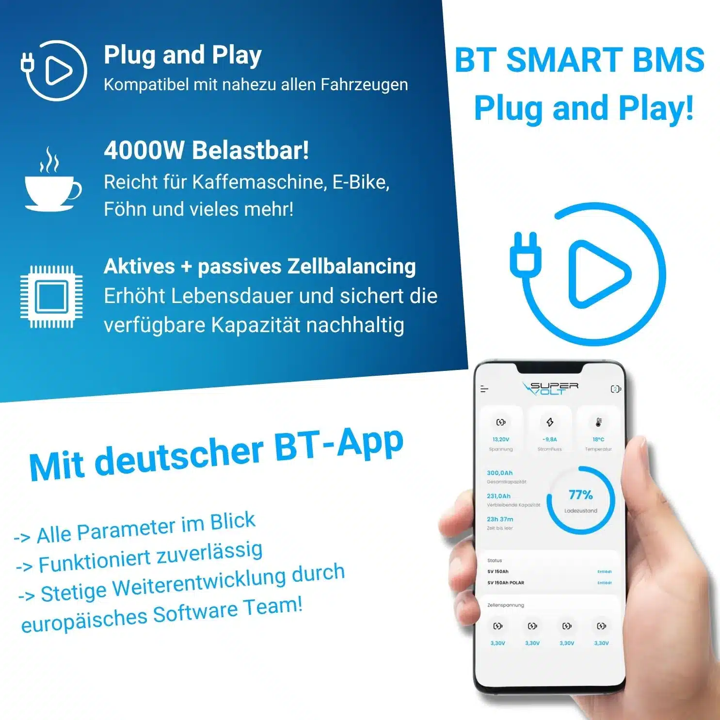 - Intelligentes BMS mit Schutz vor Überladung, Tiefentladung, Überhitzung & Kurzschluss