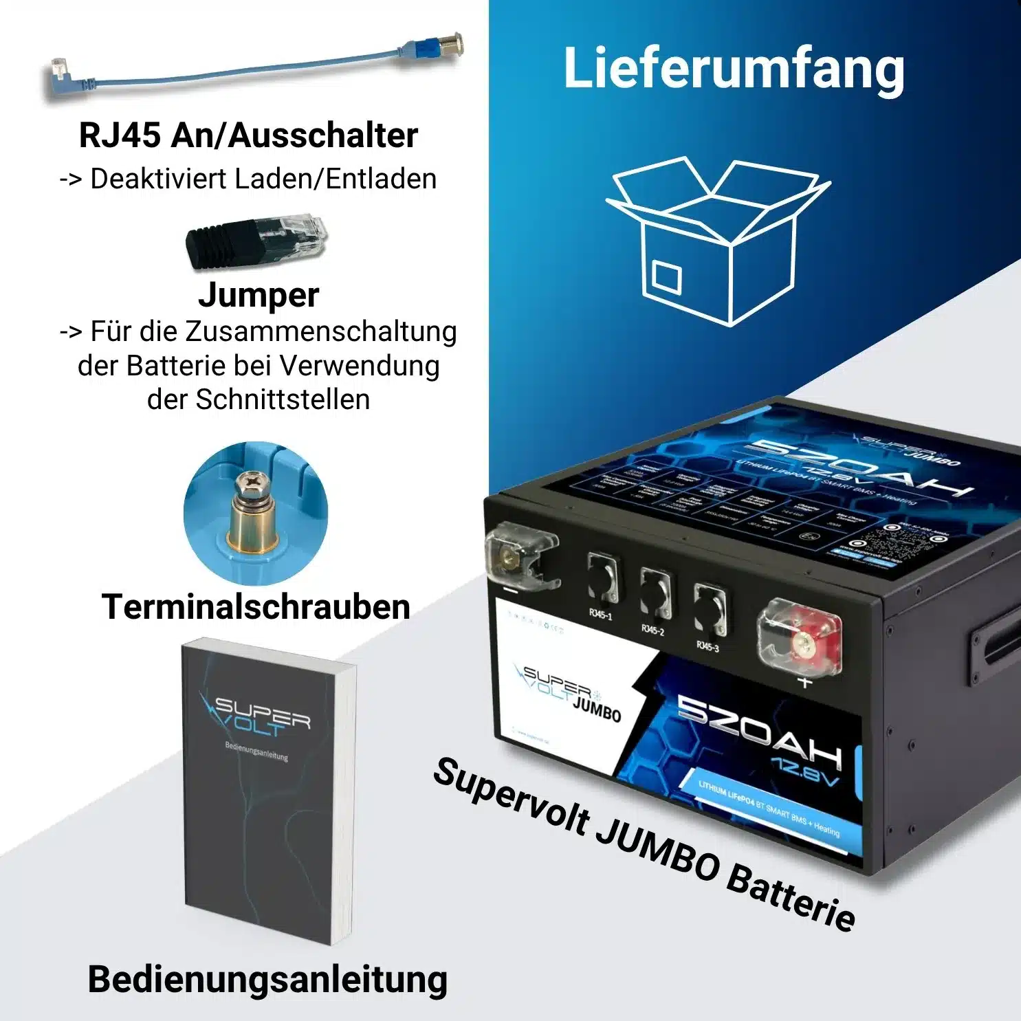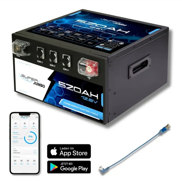 Die 520 Ah JUMBO-LiFePO₄ 12 V Batterie ist mit einem intelligenten BMS ausgestattet, das zuverlässig vor Überladung, Tiefentladung, Überhitzung und Kurzschluss schützt. Zertifizierungen wie CE, ECE R10 und UN38.3 garantieren höchste Sicherheitsstandards. Über Bluetooth 5.0 und die Supervolt-App hast du alle Werte in Echtzeit im Blick.